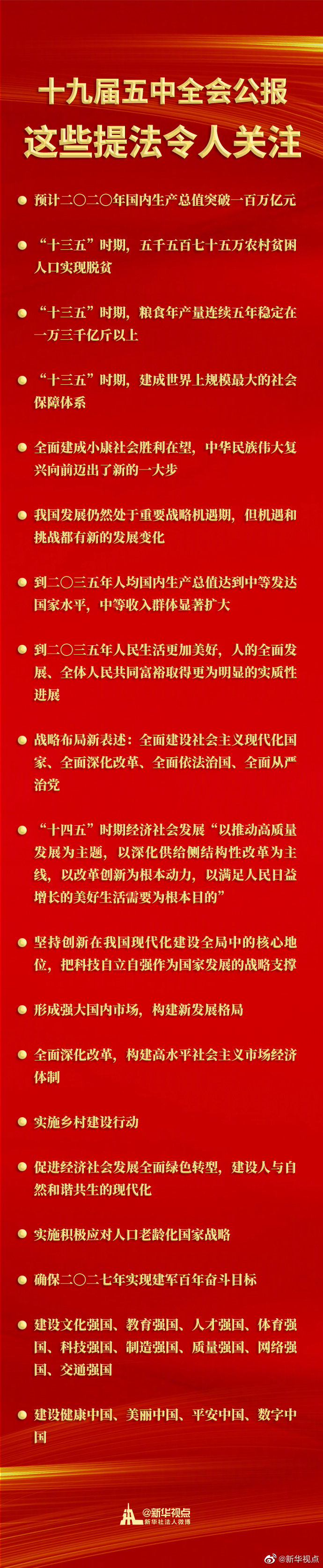 “我國經(jīng)濟實力、科技實力、綜合國力將大幅躍升,經(jīng)濟總量和城鄉(xiāng)居民人均收入將再邁上新的大臺階”“基本實現(xiàn)新型工業(yè)化、信息化、城鎮(zhèn)化、農(nóng)業(yè)現(xiàn)代化,建成現(xiàn)代化經(jīng)濟體系”“基本實現(xiàn)國家治理體系和治理能力現(xiàn)代化”“人均國內(nèi)生產(chǎn)總值達到中等發(fā)達國家水平,中等收入群體顯著擴大”……